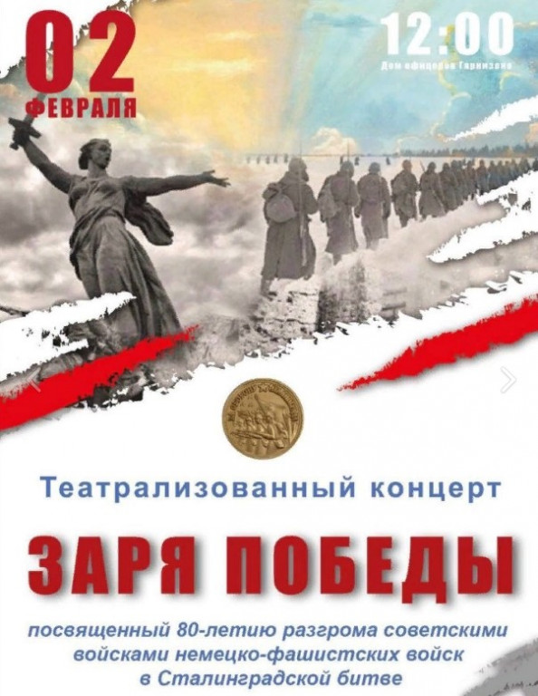 ПОБЕДЕ В СТАЛИНГРАДСКОЙ БИТВЕ ПОСВЯЩАЕТСЯ Центр народной культуры приглашает на театрализованный концерт «Заря Победы», посвящённый 80-летию разгрома Советскими войсками немецко-фашистских войск в Сталинградской битве. Мероприятие состоится 2-го февраля в Доме офицеров гарнизона. Начало в 12:00.