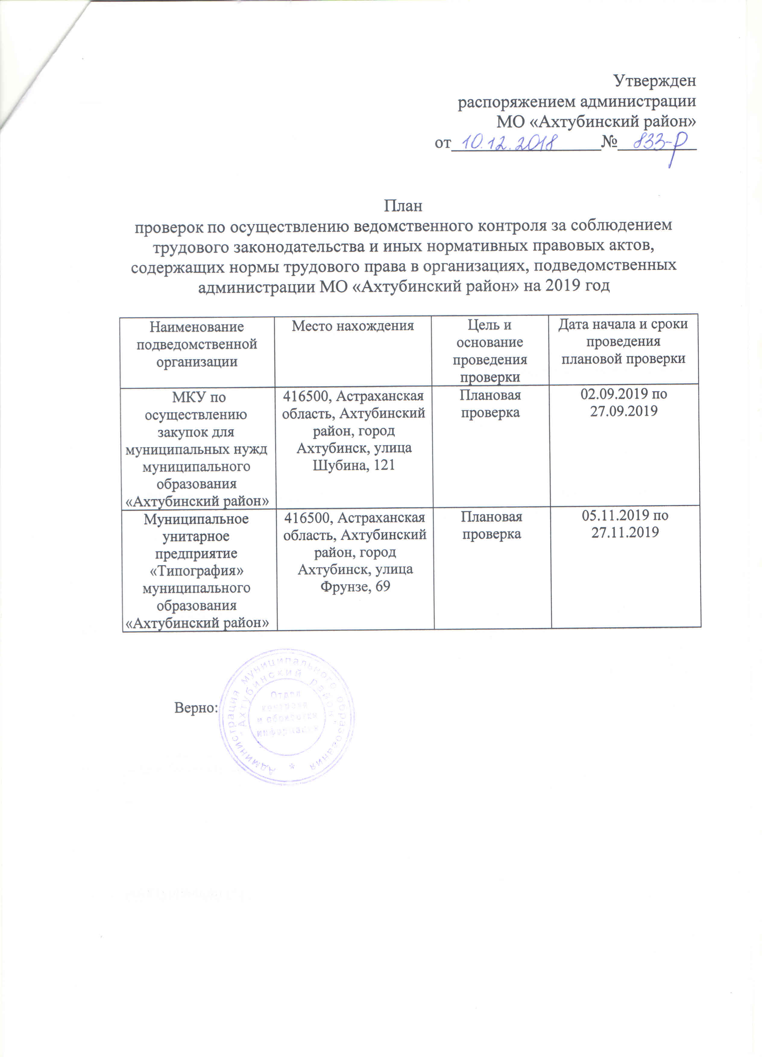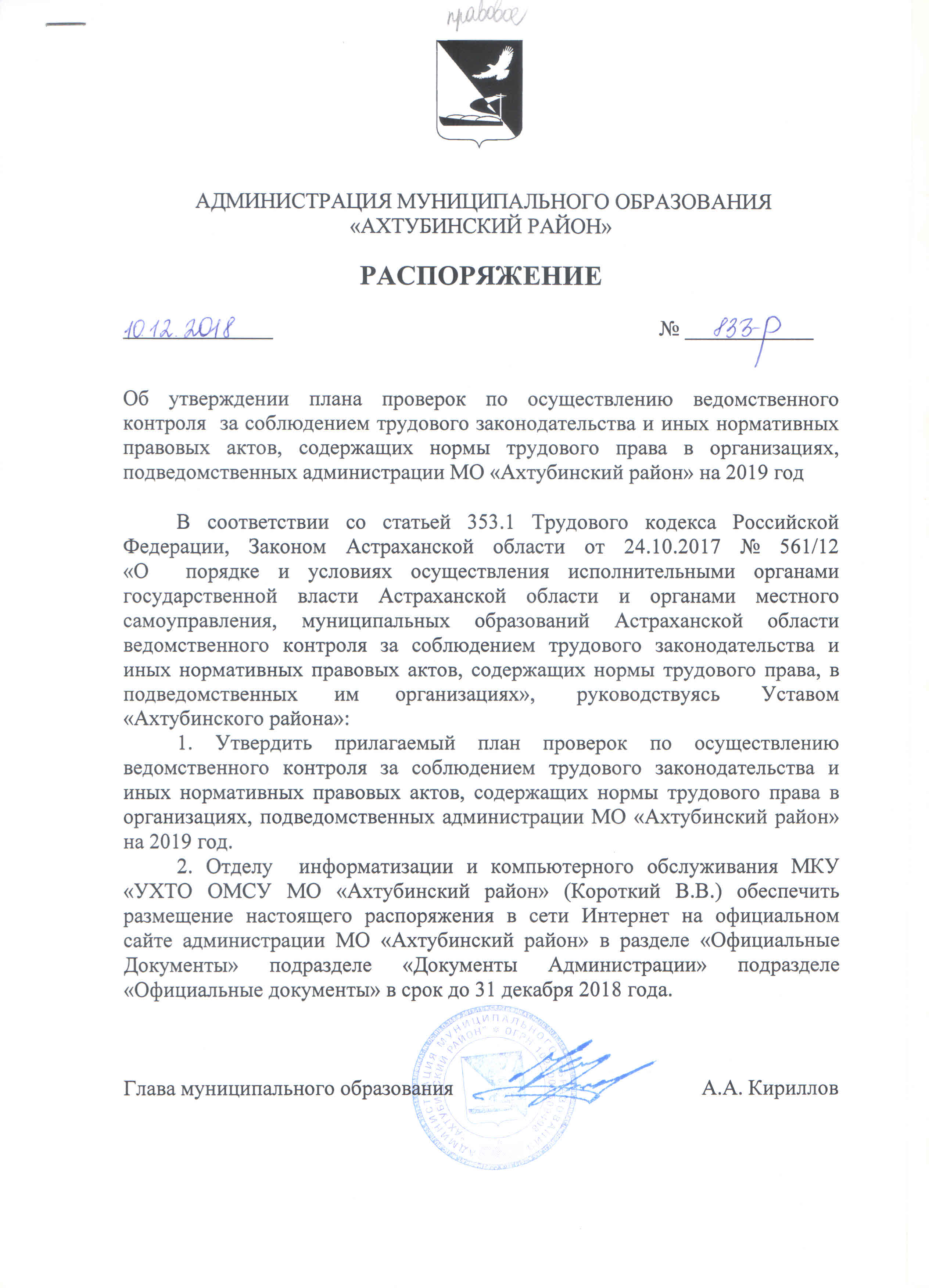 Р-е 833-р от 10.12.2018 Об утв.план.пров.проверок