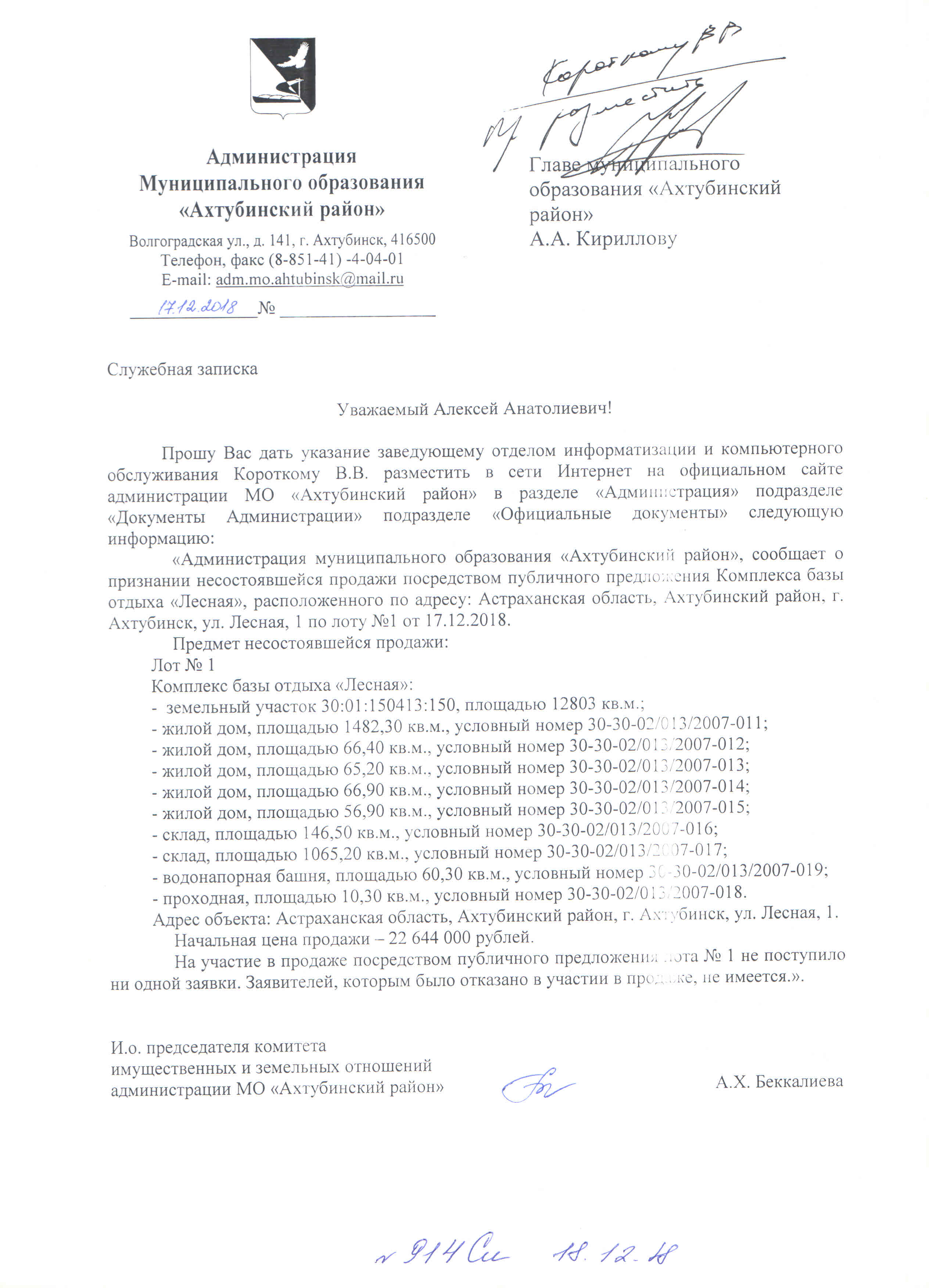 Администрация муниципального образования "Ахтубинский район", сообщает о признании несостоявшейся продажи посредством публичного предложения Комплекса базы отдыха "Лесная"