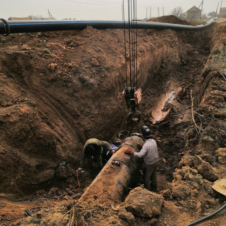 Рабочие устанавливают новую водопроводную трубу в районе посёлка Джелга
