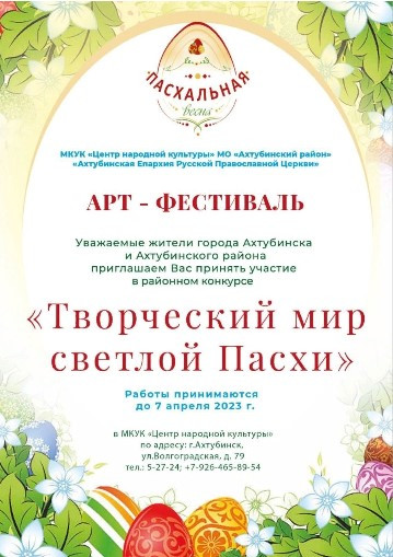 Центр народной культуры приглашает жителей Ахтубинска и Ахтубинского района принять участие в конкурсе "Творческий мир светлой Пасхи". Возраст участников не ограничен. Подробности в Положении о конкурсе (с ним можно ознакомиться на официальном сайте Управления культуры и кинофикации Ахтубинского района) и по телефону 89264658954