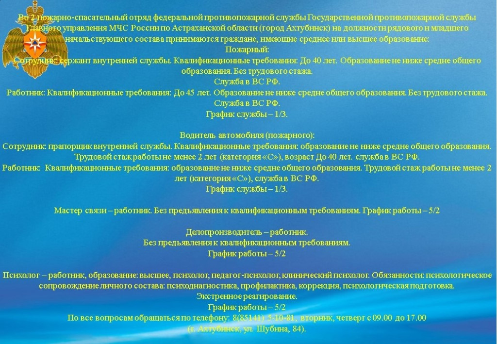 Управление МЧС России Астраханской области (Г.Ахтубинск) предлагает вакансии